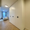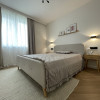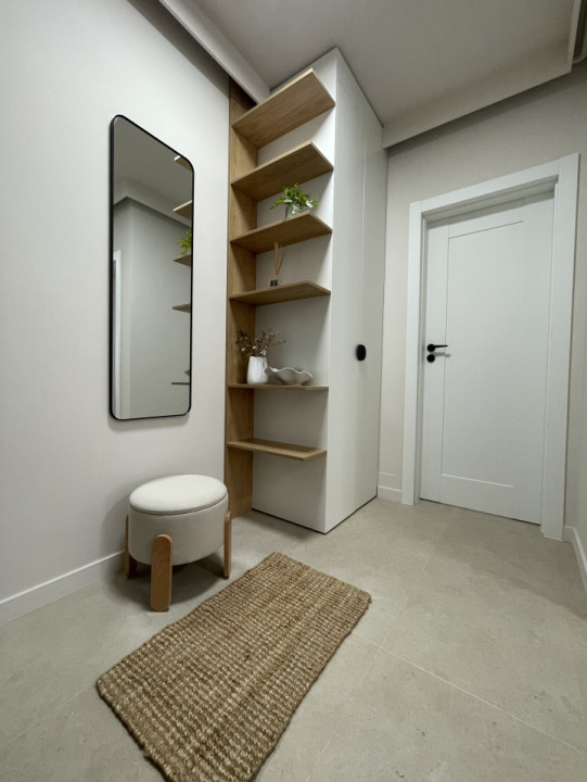 Se predă complet mobilat și utilat (baie cu oglindă luminată, spații depozitare, duș walk-in; dormitor cu pat matrimonial, noptiere și comodă; hol cu dressing cu 6 uși; living cu canapea extensibillă și masă din lemn cu 4 locuri; bucătărie: plită electrică cu inducție, cuptor electric, hotă, frigider și congelator incorporat, tacâmuri și vase pentru gătit).