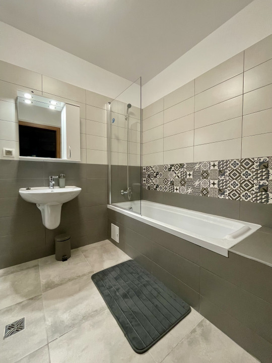 La intrarea in apartament avem holul, accesul spre baie si zona de bucatarie complet mobilata: plita si cuptor electric, hota, frigider cu congelator si mobilier. Baia este dotata cu cada si dus, toaleta, ciuveta cu oglinda si dulap.